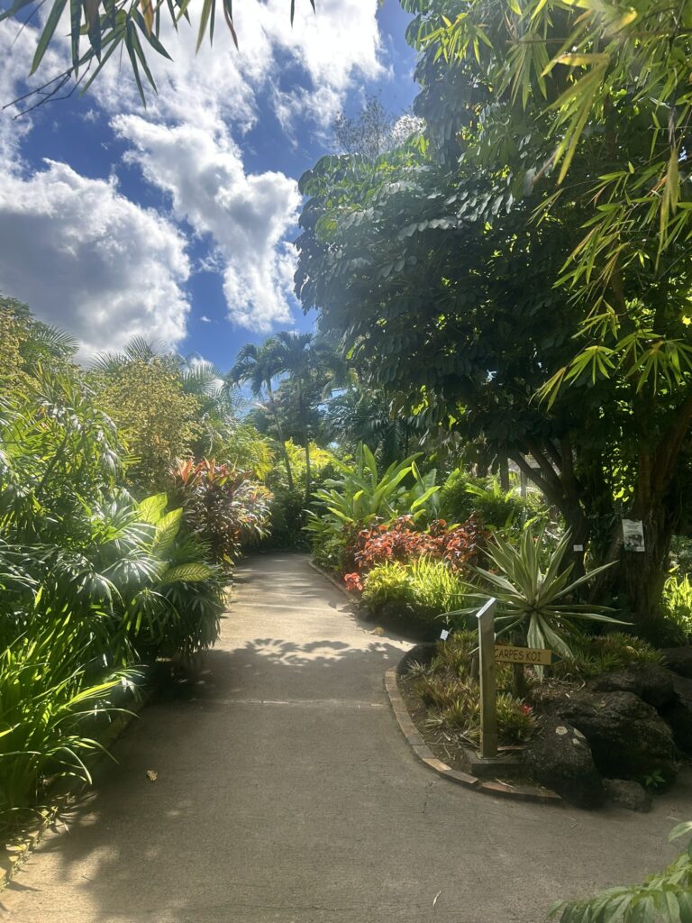 Polkujen varrelta löytyy yli tuhat kasvilajia, flamingolampi, koi-karppialtaita ja pieniä vesiputouksia, jotka luovat puutarhaan rauhallisen, trooppisen äänimaiseman. Kirkkaiden bougainvilleoiden, orkideoiden ja korkeiden palmujen värit tekevät kävelystä kuin kulkisi läpi elävän maalauksen.